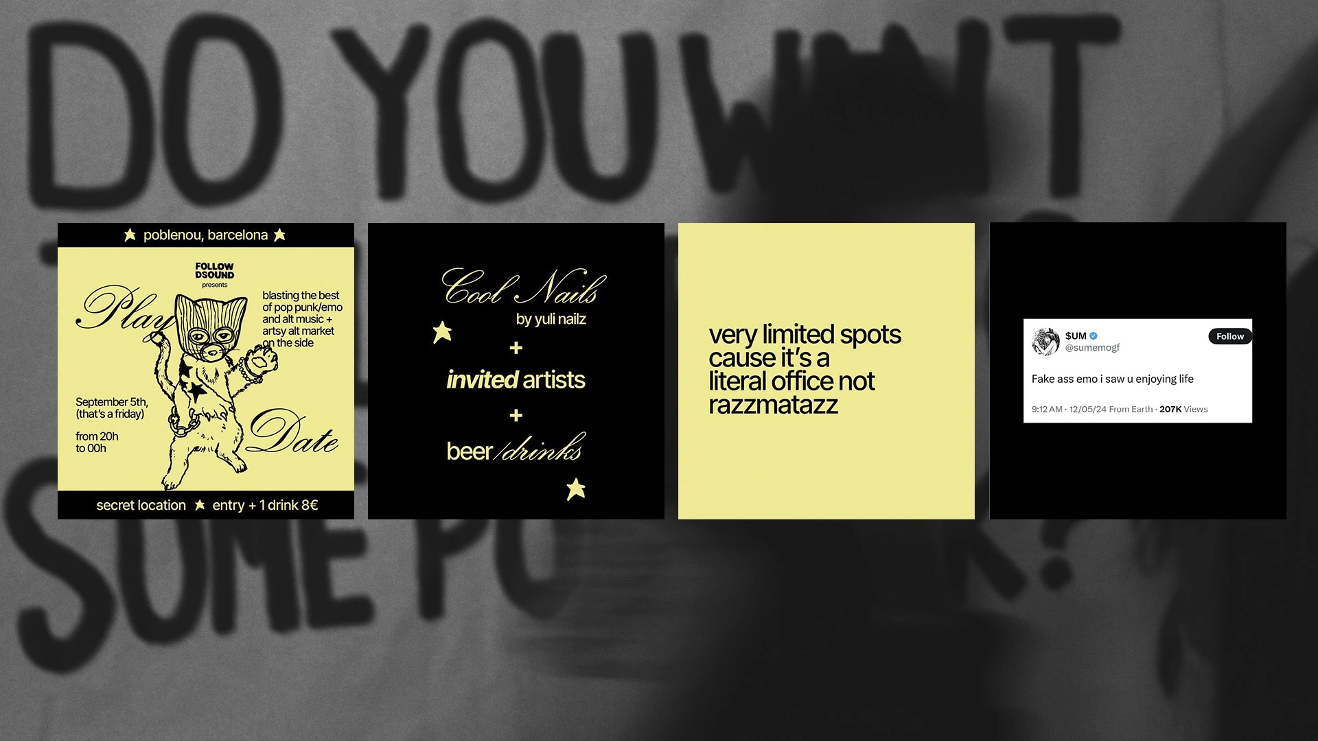 FollowDSound is a community based in Barcelona who gathers around international and local alternative/pop punk/emo music, aiming to bring together people who connect because of this genre. Artists/musicians/designers and just fans of the alternative scene are welcome to come to the events and make the most out of the local scene.